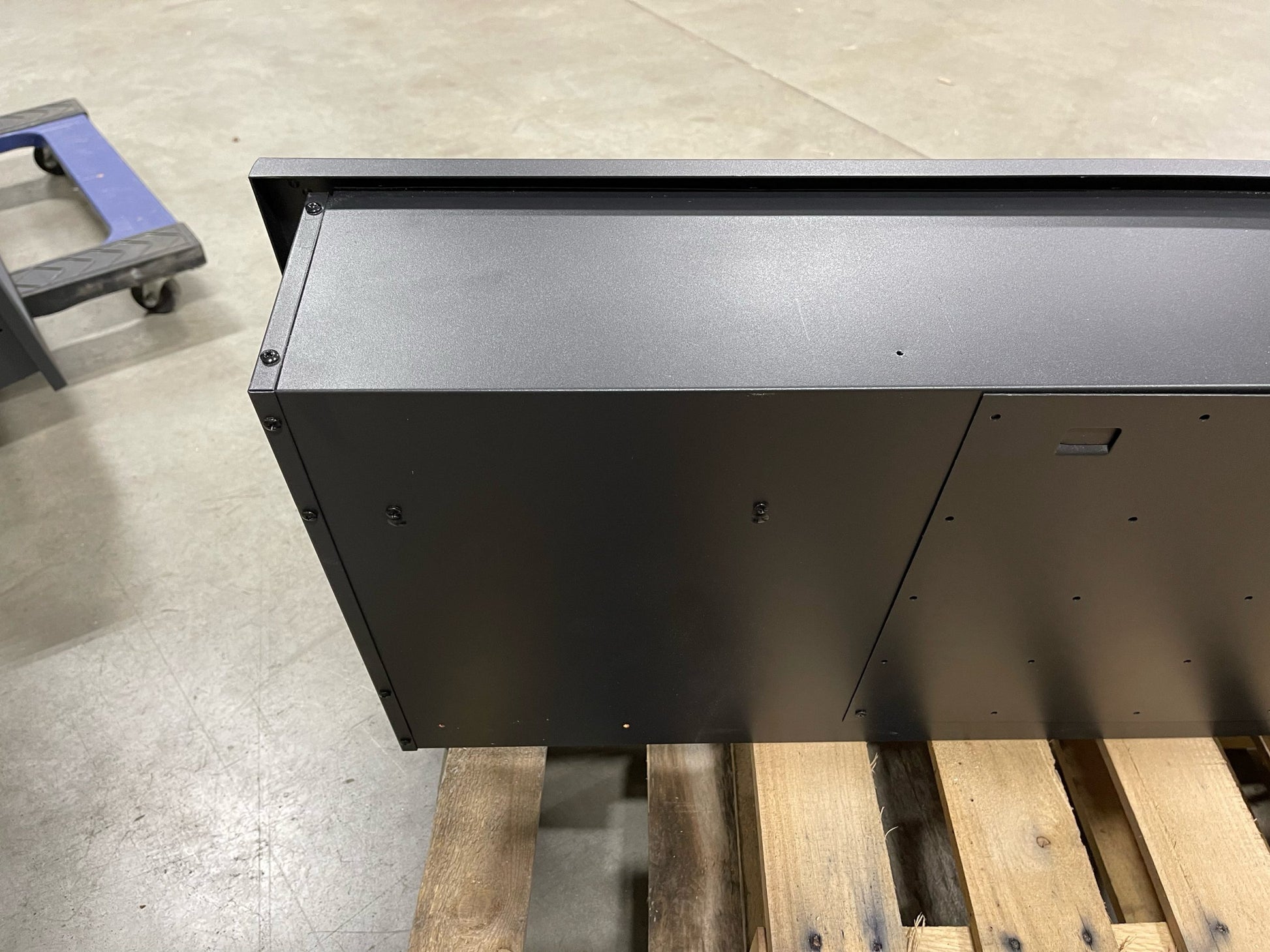 This fireplace has been inspected and tested to function properly. The fireplace has been used as a showcase model for trade shows. There are minor defects to the firebox, where the unit was affixed to displays. This fireplace will come with fire glass and a 1 piece log set. See photos and video for product condition.