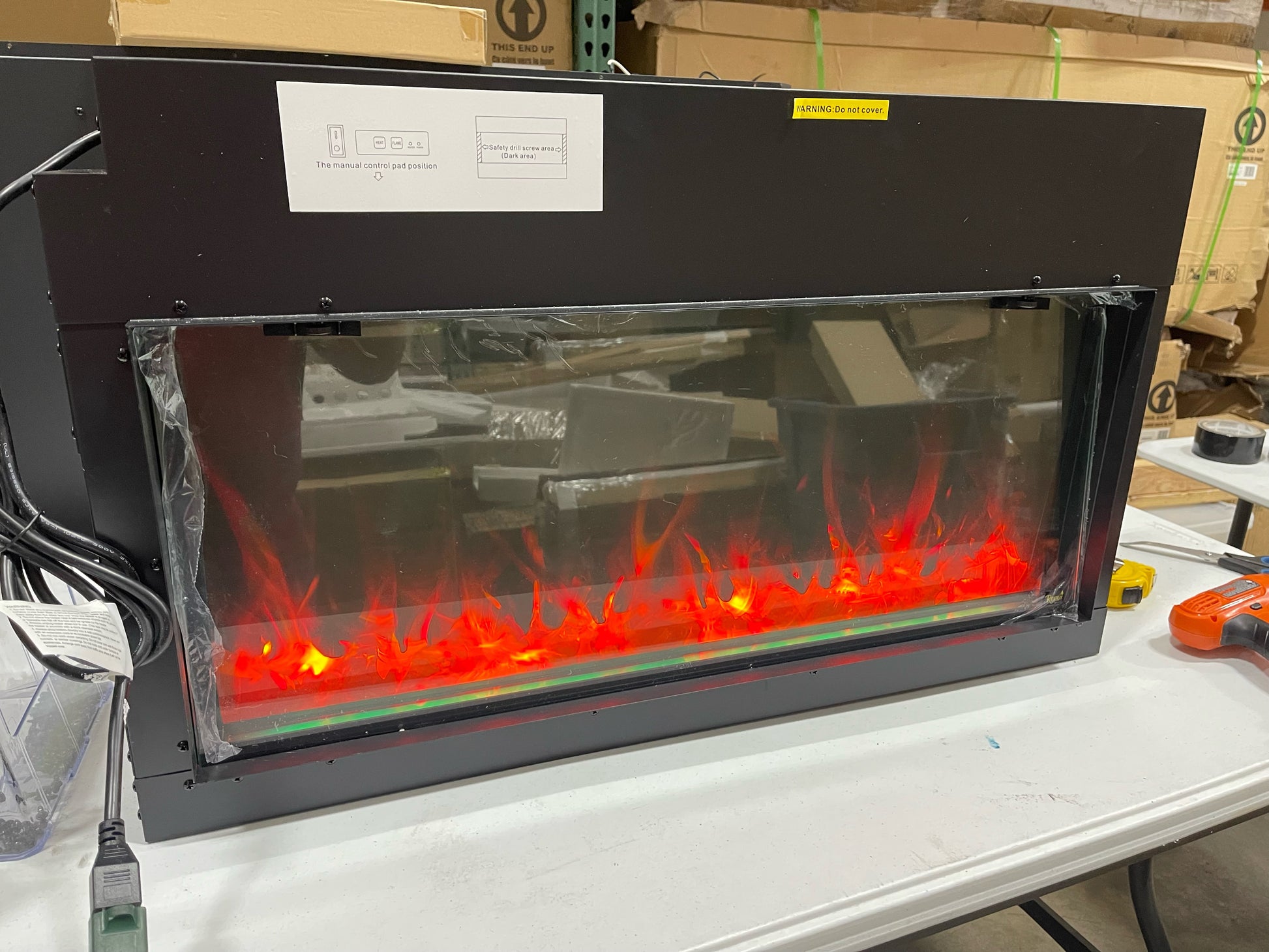 This fireplace has been inspected and tested to function normally. The back glass has been replaced due to breakage during transport. See the images and media for condition.